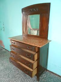 Vendesi antico como' con specchiera, a 4 cassetti, con intarsi, manca il marmo, come da ultima foto, dim.: 120x54 cm. altezza 100 cm, specchiera 100x90 cm. a 50 euro.