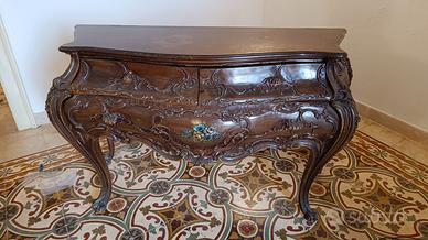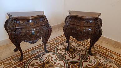 Comò e comodini in stile barocco-legno-massello vintage francese Luigi XV realizzati in legno massello con ricche decorazioni intagliate a mano. Le forme bombate, i motivi floreali e le gambe sagomate conferiscono grande eleganza e valore decorativo.