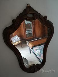Comò con specchio, due comodini con specchio, primi del '900, tutto in legno intagliato con decori fatti a mano, ottimo stato. Disponibile a vendere anche separatamente. E' abbinabile ad intera camera da letto con armadio, sponde letto e toeletta trucco
