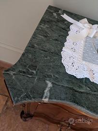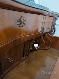 Trittico stile Luigi XV Composto da un comò con segrete' a 5 cassetti e due comodini coordinati. Piano in marmo verde alpi, legno noce massello. Raffinati dettagli in rilievo.