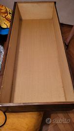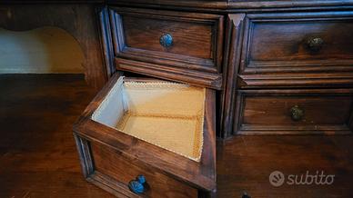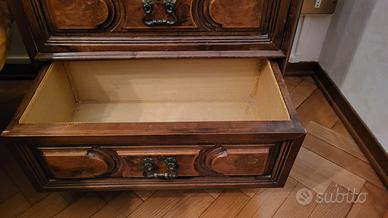 Vendo como' in legno massello intarsiato e coppia di comodini, rifiniti in tessuto. Consegna a mano