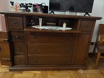 Como’ e comodini in noce nazionale, il comò aperto ha uno specchio ha cassetti piccoli da entrambi i lati e tre cassetti centrali grandi