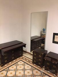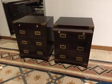 Comò e comodini in stile marina provenienti dagli arredamenti originali della nave italiana “Città di Tripoli” che ha navigato negli anni ’30 del secolo scorso. Si tratta di due comodini e un cassettone in mogano con accessori in ottone (maniglie dei cassetti, salva angoli e pomelli). Il cassettone ha un piano estraibile che può essere usato come scrivania e anche i comodini hanno un pianetto estraibile. Il comò ha quattro cassetti e i comodini sono provvisti ognuno di tre cassetti. I tre elementi sono tutti in buono stato, solo la lucidatura ha perso un po’ di brillantezza e ha bisogno di essere solo ravvivata. Sono ideali per una casa al mare.