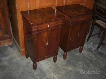 Comò cassettone con pendant di comodini. In noce. Antiquariato, prima metà dell'800. Comò: altezza 92 cm, larghezza 138 cm, profondità 59,5 cm. Comodini: altezza 81,5 cm, larghezza 46 cm, profondità 37 cm. La serratura dei due comodini chiude nel contempo anche i cassetti. Solo ritiro sul posto: non si consegnano e non si spediscono.