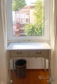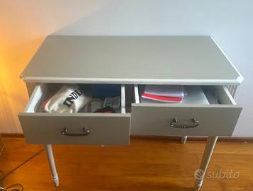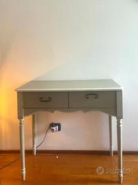 Bellissimo comò in legno in stile vintage (L87 x P42 x H76 cm). Color grigio chiaro con leggera finitura decapata. In eccellenti condizioni, ideale per camera da letto, corridoio o soggiorno.