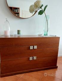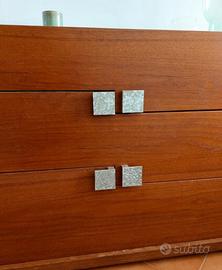 Splendido comò di alta fattura, caratterizzato da linee rigorose e dettagli materici tipici del design italiano della metà del secolo scorso. Un pezzo d'arredo solido e di grande impatto visivo, perfetto per una camera da letto o un living contemporaneo. Caratteristiche Principali: Qualità del Legno: Il mobile presenta una splendida venatura orizzontale fiammata. Si tratta probabilmente Noce Tanganica di alta qualità. La finitura è satinata, molto calda al tatto e alla vista. Colore: Una tonalità noce medio/miele, profonda e uniforme, che si sposa perfettamente con pavimenti in cotto (come in foto) o parquet. Dettagli di pregio: Le maniglie sono il vero punto di forza: quattro elementi quadrati in metallo con finitura martellata/materica (probabilmente alluminio o zama trattata) che donano un tocco industriale ed elegante. Struttura: Composto da tre ampi cassettoni a scomparsa totale nel telaio, con una base a zoccolo chiuso che conferisce stabilità e compattezza. Dimensioni: Larghezza: 110 – 120 cm Altezza: 75 – 80 cm Profondità: 45 – 50 cm Il ritiro è a cura dell'acquirente presso magazzino ad Aprilia. Prezzo trattabile.