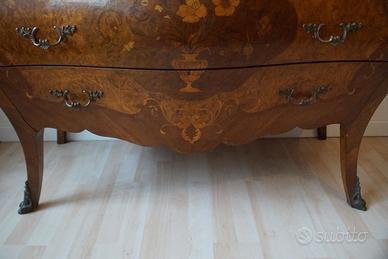 Comò in stile Luigi XV intarsiato a 3 cassetti con piano in marmo con dettagli in bronzo epoca '900. Dimensioni: L. 120cm - P. 53cm - H. 86cm Ottime condizioni Solo ritiro