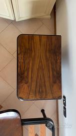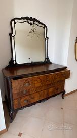 Vendo set completo coordinato composto da coppia di comodini, madia e specchiera, specchio piccolo. Set caratterizzato da uno stile classico con influenze vintage e dettagli artigianali. Ogni elemento presenta una struttura solida in legno massello, gambe sagomate e intagliate, profili curvi e una finitura scura che mette in risalto le venature naturali dei pannelli frontali, realizzati con un particolare motivo fiammato che dona unicità e carattere ai pezzi. I comodini sono dotati di ante con pomelli metallici decorativi e offrono uno spazio interno comodo e ben sfruttabile; il comò offre capienza aggiuntiva ed è adatto sia alla camera da letto sia ad altri ambienti della casa; la specchiera completa il set aggiungendo luminosità ed eleganza. Tutti i componenti sono in buone condizioni generali, con normali segni del tempo che testimoniano l’autenticità e l’età del mobile senza comprometterne la funzionalità o l’estetica. Ideale per chi cerca un arredo robusto, distintivo e perfetto per aggiungere un tocco caldo e raffinato a camere, ingressi o zone living dallo stile classico. Vendita con formula visto e piaciuto, senza possibilità di reso. Prezzo vendita e spedizione trattabili. Spedizione a carico dell'acquirente oppure possiamo accordarci per il ritiro di persona zona Verona.
