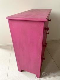Un pezzo non più in produzione, perfetto per chi cerca un arredamento dal carattere romantico, shabby chic o per una cameretta speciale. Il mobile è realizzato in legno riciclato, solido e duraturo, con una finitura rosa vivace molto ricercata (citato anche in riviste di design come Elle Decore). In pieno spirito Shabby Chic, ogni mobile è un pezzo unico: le lievi irregolarità della finitura e del legno non sono da considerarsi difetti, ma il tratto distintivo di uno stile che celebra l'autenticità e la lavorazione artigianale.