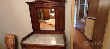 Piano in marmo e specchio originali, cassetto e ripiano chiuso con antine, manca listello di battuta antina e presenta forature da tarli.