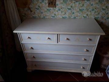 Comò shabby in decapè bianco anticato con decori stencil ocra in legno massello usato pochissimo in una seconda casa