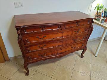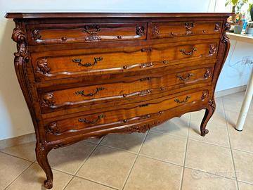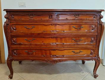Comò in legno stile Luigi XV con lavorazioni sagomate e maniglie decorative.