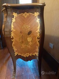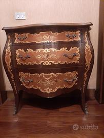 Riproduzione di un classico comó Luigi XV, con intarsi di varie essenze lignee e motivi geometrici sia sul piano che su fiancate e cassetti.