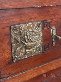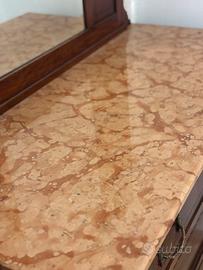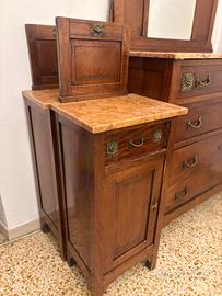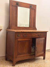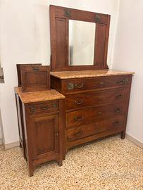 Vendo elegante comò con specchiera risalente ai primi del Novecento, realizzato in legno massello con piano in marmo originale. Ferramenta originale in ottone con decori floreali in stile Liberty. Il mobile si presenta in buone condizioni generali, con normali segni del tempo che ne attestano l’autenticità. Struttura solida, cassetti scorrevoli, marmo integro. Ideale per arredamenti classici, case d’epoca o come pezzo di carattere in ambienti moderni. Ritiro a mano Lotto intero 900 trattabili Pezzi separati su richiesta