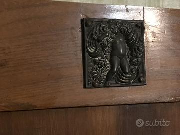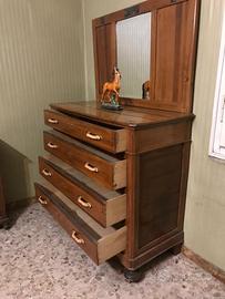 Comò in legno chiaro con inserti di bronzi patinati raffiguranti angeli puttini; maniglie in osso. Quattro ampi cassettoni con specchiera superiore.