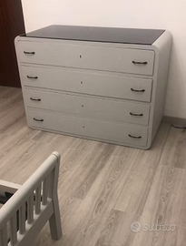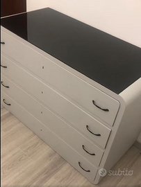 Comò a quattro cassettoni con un design particolarmente bello risalente agli anni 50. Il vetro originale era danneggiato, pertanto è stato sostituito con quello che è al momento presente, ordinato e fatto fare su misura. Struttura in legno (esterno impiallacciato) massello di abete, è stato completamente verniciato finemente con della vernice ad acqua. (lunghezza 120 cm, altezza 85 cm, profondità 55 cm)