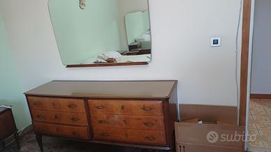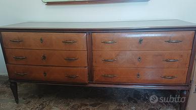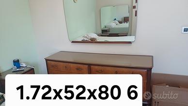 INTERESSANTE COMO' ANNI 60 CON RIPIANO IN VETRO, 6 AMPI CASSETTI CON MANIGLIE D'EPOCA , SPECCHIERA IN CORNICE. MISURE. LUNG. 1,70×52×80