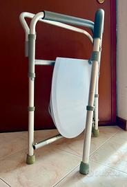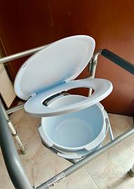 Comoda pieghevole in alluminio, leggera e robusta. Nuova, condizioni assolutamente perfette, mai usata. 4 modalità di utilizzo: comoda, rialzo WC, sedia da doccia, e telaio stabilizzante. Regolabile in altezza. Secchio estraibile con manico. Puntali in gomma antiscivolo. Può essere facilmente piegata per il trasporto o per il ripostiglio.