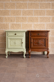 Oltre a poter essere acquistata nello stato originale, il mobile si presta molto bene anche a un intervento di restauro e verniciatura, come mostrato nell’immagine dimostrativa. Una finitura, ad esempio bianca o di altri colori, permette di trasformare completamente il mobile, rendendolo più luminoso e adatto anche a interni contemporanei, shabby chic o classico rivisitato, senza perdere il fascino delle lavorazioni originali.