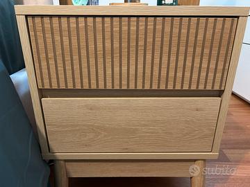 Set di 2 comodini da camera da letto, color legno naturale, con 2 cassetti a chiusura soft close. Dimensioni: h 48 cm (33 cm cassetti, 15 cm i piedi), largh. 40 cm, prof. 39 cm.