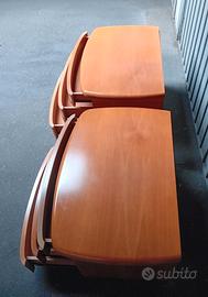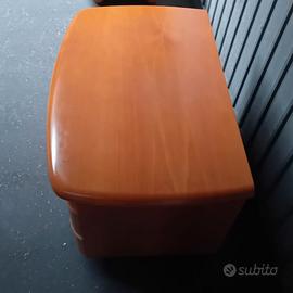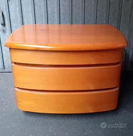 Vendo coppia di comodini in legno, dalla forma leggermente ovale e smussata negli angoli, sul piano e sui 3 cassetti, il primo meno capiente degli altri 2 sotto. Misurano in altezza 48 cm, larghezza 67 cm, profondità 45,5 cm.