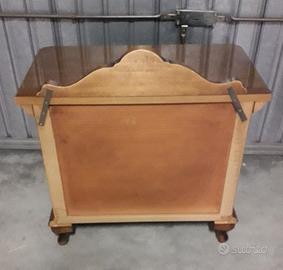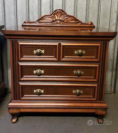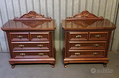 Vendo coppia di comodini in legno, con alzata volendo estraibile, dotati di tre cassetti e 4 piedini d'appoggio . Le misure sono : h.tot.75.5 h. piano 62.5 cm, L.68 cm, p. 37 cm.