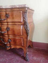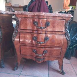 Coppia di comodini in stile Luigi XV in perfette condizioni: marmo integro e impiallacciatura di rivestimento intatta.
