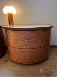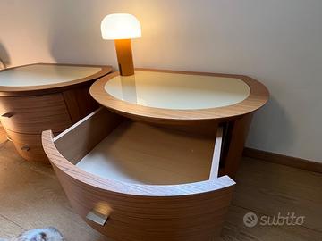 COPPIA COMODINI OVALI 2 CASSETTI LEGNO FINITURA TECH, MANIGLIA CROMATA RIPIANO IN VETRO TINTA PANNA MISURE : L 60, P 40 H 40 CONDIZIONI PARI AL NUOVO