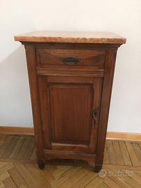 Coppia di comodini liberty, in buone condizioni, in legno con ripiano in marmo rosa. Un cassetto + un'antina. Altezza cm 81, larghezza cm 46, profondità cm 35. No spedizione, ritiro solo a mano.
