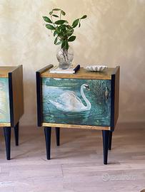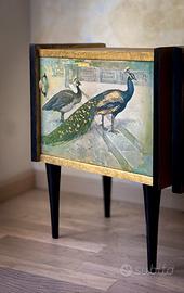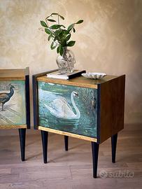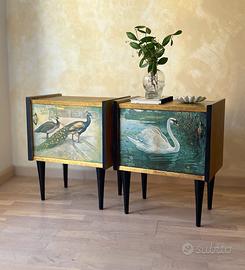 💫 COPPIA DI COMODINI VINTAGE ✨SPEDIZIONE DISPONIBILE TUTTA ITALIA 📦 Trasforma il tuo spazio con questa raffinata coppia di comodini vintage restaurati, veri pezzi unici dallo stile eclettico e massimalista. Ogni mobile è stato sapientemente recuperato e decorato a mano con la tecnica del découpage, utilizzando illustrazioni antiche che raffigurano eleganti pavoni e un maestoso cigno immersi in ambientazioni naturali e suggestive. Le immagini botaniche e faunistiche, provenienti da carte illustrate d’epoca, donano un fascino narrativo e poetico a ciascun pezzo. La palette cromatica gioca su toni sofisticati di oro, verde, azzurro e nero, ideale per chi cerca un elemento d’arredo scenografico, ricco di personalità e carattere. Perfetti come comodini, ma anche come piccoli mobili d’accento in soggiorno, ingresso o studio, questi elementi sapranno aggiungere un tocco retrò e originale alla tua casa. 📏 Dimensioni approssimative: h 50, p 25, L 45 🎨 Tecnica: découpage con carta illustrata antica 🛠️ Restauro artigianale e finiture di pregio Prezzo per la coppia. 📦 SPEDIZIONE DISPONIBILE IN TUTTA ITALIA Comodini Vintage in Stile Eclettico – Découpage Artistico con Illustrazioni Antiche