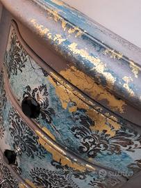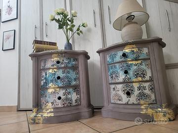Comodini meravigliosi in legno antico massiccio, ampi cassetti, rivisitati in stile materico color tortorelle, con dettagli in foglia oro che donano luce, finitura a cera, prodotti di prima qualità.