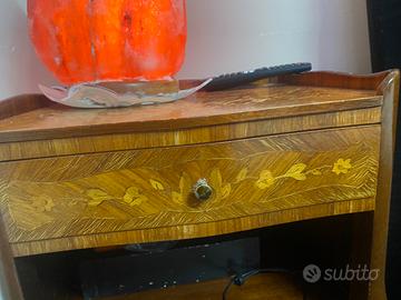Vendo per cambio stile,comodino in legno decorato e fregio in ottone sul fondo del piede,tenuto bene,segnalo la parte superiore un po’ saltato il trasparente,ma non si nota visto da lontano