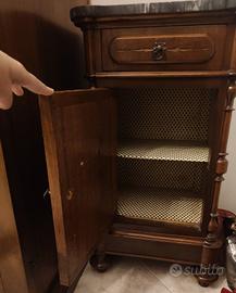 Vendo elegante comodino antico in legno massello con piano in marmo originale. Il mobile presenta un design classico con colonnine tornite laterali, cassetto superiore con pomello in metallo e vano con sportello nella parte inferiore.