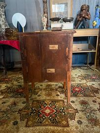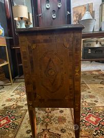 • Struttura: Due capienti cassetti frontali con serratura originale e chiave presente. Gambe a tronco di piramide rovesciata (tipiche dello stile Neoclassico) anch'esse intarsiate.