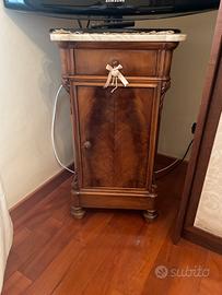 Comodino antico buonissime condizioni con marmo striato di copertura, un cassetto e un antina con ripiano interno.