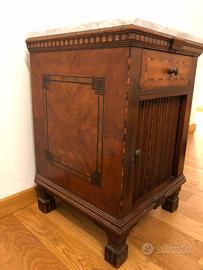 Vendesi splendido comodino antico in pieno stile Luigi XVI (fine '700 / metà '800), realizzato in pregiato legno di noce con raffinati intarsi geometrici fatti a mano. Il mobiletto è caratterizzato da un piano superiore in marmo bianco. Dispone di un cassetto frontale intarsiato e di un vano inferiore con apertura a serrandina (tamburo), dettaglio tecnico ed estetico tipico dell'ebanisteria neoclassica. Questo pezzo d'antiquariato è estremamente versatile: oltre che come classico comodino da camera, può essere utilizzato come elegante mobiletto d'ingresso o raffinato tavolino da salotto. Le sue linee sobrie lo rendono perfetto per essere accostato a una lampada di design, una cornice antica o posizionato sotto uno specchio per creare un angolo di carattere. Si abbina magnificamente sia in un contesto classico, accanto a una cassettiera o un armadio d'epoca, sia in un ambiente moderno come elemento di contrasto vicino a un tavolo minimalista o a una poltrona in velluto. Dimensioni: •Altezza: 66,5 cm •Larghezza: 43 cm •Profondità: 41,5 cm