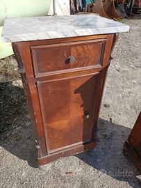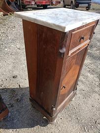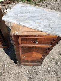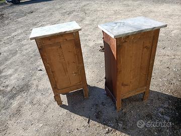 Coppia di comodini in legno e ripiano in marmo nelle condizioni visibili in foto e come da ritrovamento Misure indicative 38x29 x h 87