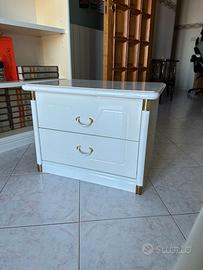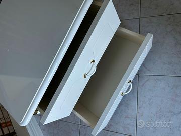 Vendo comodino in legno colore bianco con 2 ampi cassetti, elegante e funzionale. Design classico con dettagli dorati e maniglie coordinate, perfetto per cameretta o stanza da letto. ✔️ Due cassetti capienti e scorrevoli ✔️ Struttura solida e stabile ✔️ Colore bianco facilmente abbinabile ✔️ Ideale come comodino o piccolo mobile contenitore Il comodino è in buone condizioni generali, con solo lievi segni di utilizzo (visibili in foto).