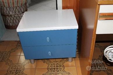 solido comodino bicolore in bianco e cassetti celesti con piedi sollevato da terra , misure 50 di larghezza x 35 di profondità alto 45 cm. vendo euro 29.