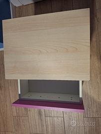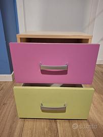 Comodino cameretta color frassino, con 2 cassetti, fucsia e verde mela