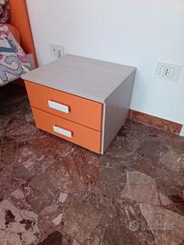 Comodino 2 cassetti per cameretta bambino/a. Arancio e pino chiaro. Ottime condizioni usato pochissimo. In più altri pomelli a forma di puzzle. Eventualmente letto singolo abbinato (altro annuncio).