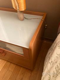 Cassettiera in legno bassa che funge anche da comodino con ripiano in vetro satinato. Due cassetti di cui uno con frontale in vetro. Misure larghezza 70,5 cm profondità 47 cm altezza 43 cm. Non ha difetti i cassetti scorrono bene.