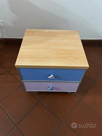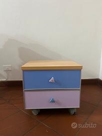 Comodino su ruote con due cassetti in ottime condizioni. Misure: 45cm larghezza , altezza con ruote 42 cm, profondità 42cm