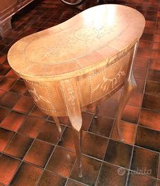 Comodino da soggiorno /ingresso ‘a fagiolo’, in stile Neo classico, richiama i lavori di Giovanni Maggiolini, intarsiato con legni chiari, probabilmente ciliegio, bosso, noce, con decori floreali sul piano, nello sviluppo posteriore e laterale, nei frontali dei due cassetti. Misure 47x30x 73 cm di altezza.