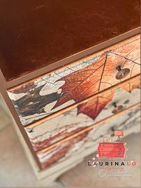 Questo comodino in legno è stato interamente restaurato e dipinto a mano, con finiture di pregio e decoupage artistico a tema foglie.