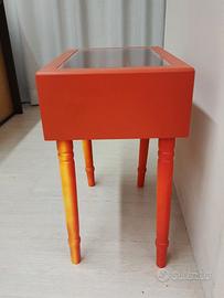 Comodino di J line con cassetto/bacheca espositiva ad effetto "valigia", in legno laccato rosso e gambine in degradè rosso e arancione. Stile Pop. L'articolo è stato usato in ESPOSIZIONE all'interno del nostro showroom.