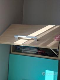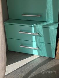 Vendo come da foto, comodino due cassetti e vasistas camera da letto per ragazzi, bambini, o studio. In legno, color frassino e verde acqua. Predisposizione per appenderli a parete. Ottimo stato. Disponibili anche n.2 cubotti contenentivi in legno 30×30 color blu avio. Solo scambi o a mano.