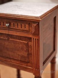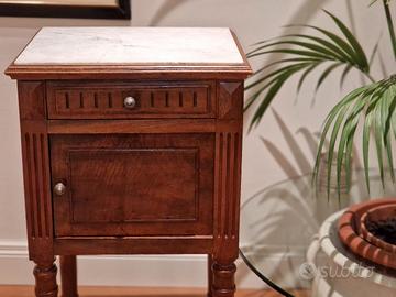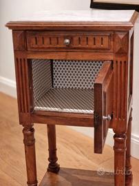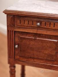 Bellissimo comodino d'epoca, francese , in noce , con ripiano in marmo bianco, cassettino e cassetto grande porta oggetti. Tenuto molto bene, con qualche segno dell'età. Abbinabile a qualsiasi arredamento, sia moderno che classico.