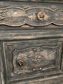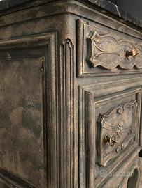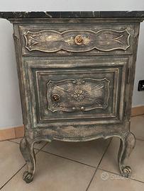 Comodino stile barocco Piemonte,rivisitato effetto materico, anticato con le cere e tocchi di luce oro.piano in marmo nero.Misura L 52 P34 H 70