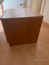 Cendo comodino in legno color ciliegio, lungo 53 cm, alto 41 cm e profondo 46 cm. Il comodino presenta sul lato destro una scheggiatura facilmente riparabile.